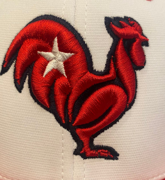 Red rooster with black outline & white star, red & white hat