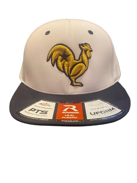 Gold rooster with navy outline & star, navy & white hat