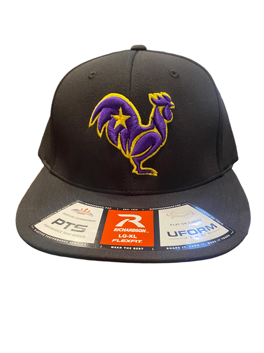 Purple rooster with yellow outline & star, black hat