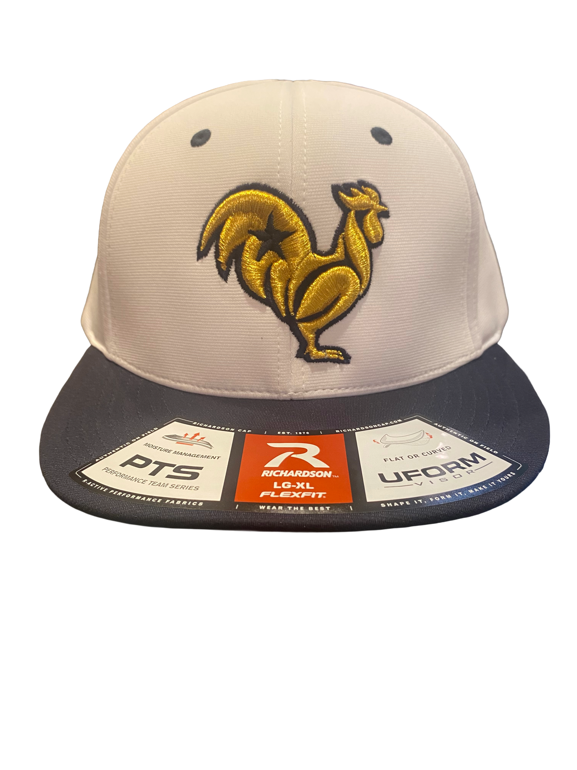 Gold rooster with navy outline & star, navy & white hat